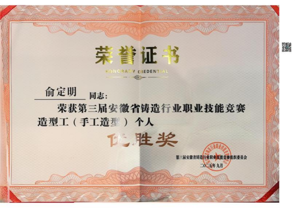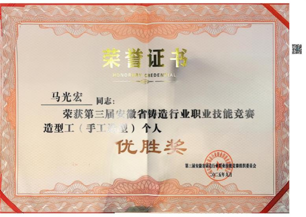 2025年09月28日,蕪湖久弘重工股份有限公司,在第三屆安徽省鑄造行業(yè)職業(yè)技能競賽中,三位選手分別榮獲三等獎(jiǎng)、優(yōu)勝獎(jiǎng)。